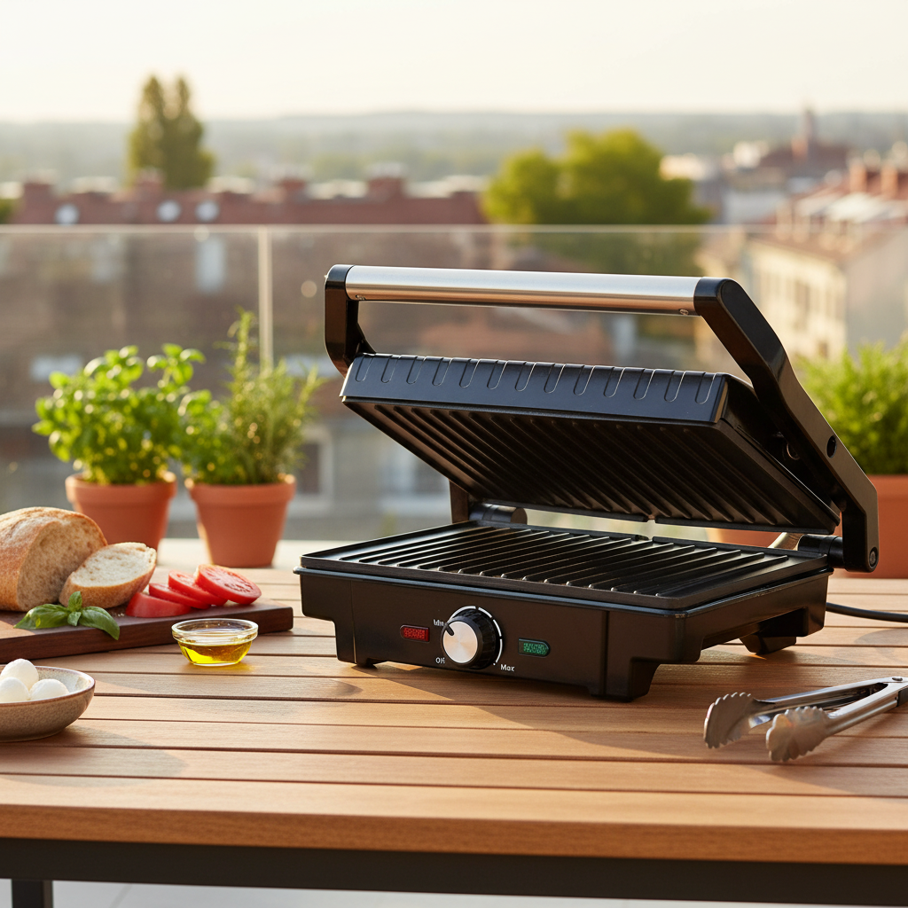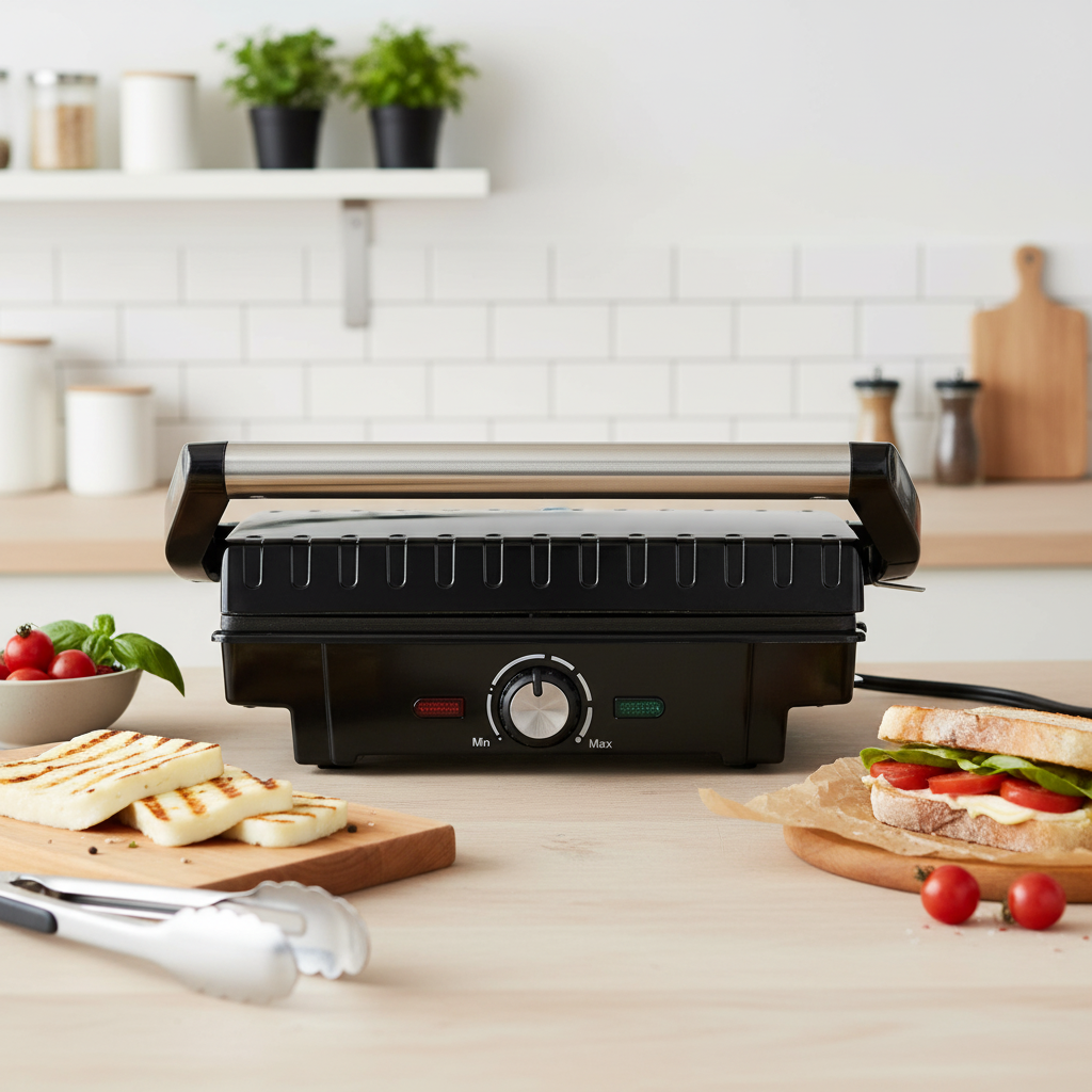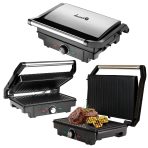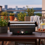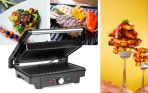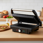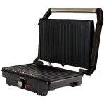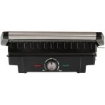 Eklektický gril s výkonem 1600 W. Regulace teploty, ploché skládací desky a dvouvrstvý teflonový povlak zabraňující přichycení pokrmů.