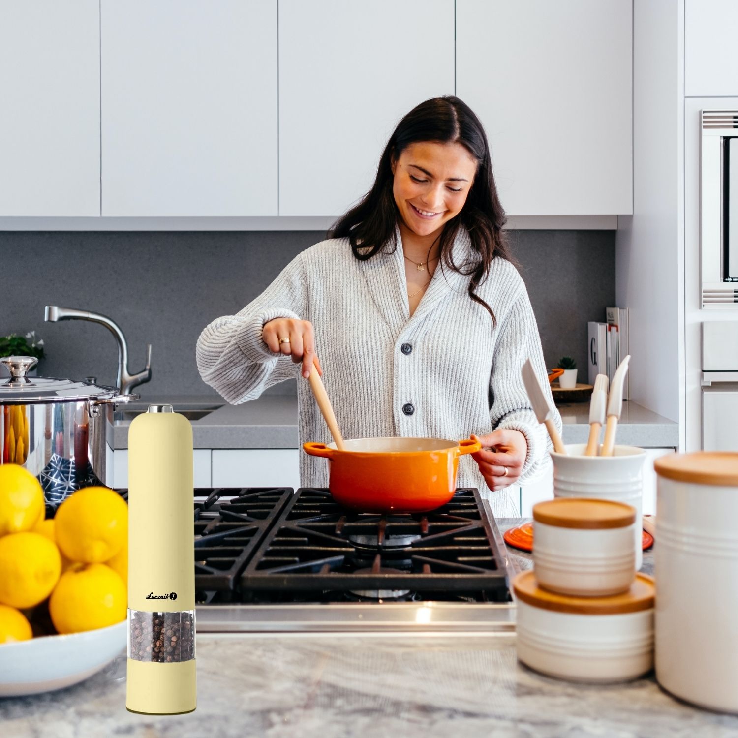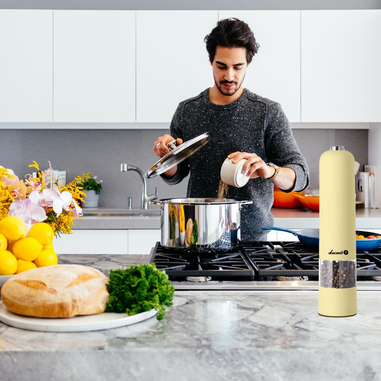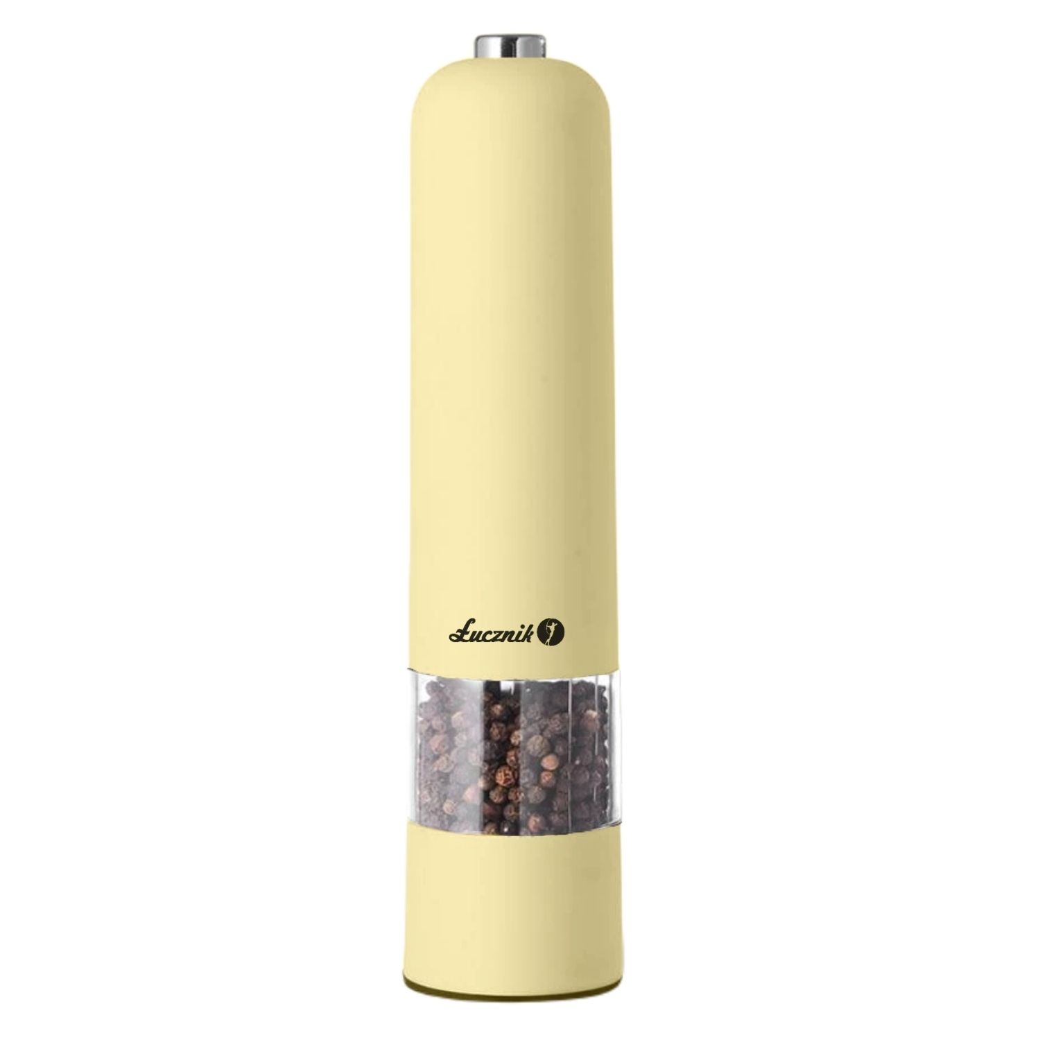 Elektryczny młynek do soli, pieprzu i przypraw PM101 w subtelnym, waniliowym kolorze. Umożliwia mielenie bez wysiłku – wystarczy nacisnąć przycisk, aby jego żarna zaczęły się obracać. Posiada również regulację stopnia mielenia pozwalającą uzyskać różnej wielkości drobiny.