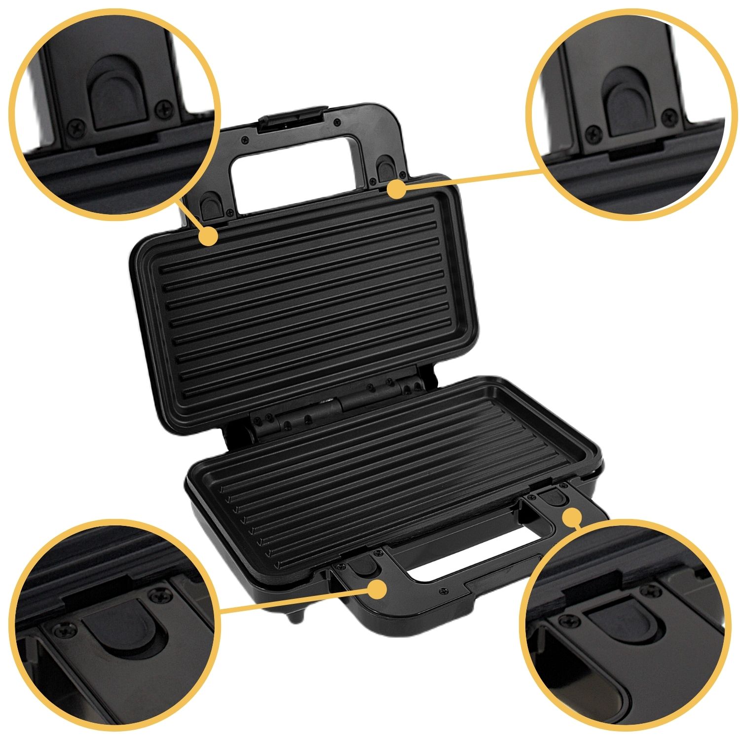 Wygoda użytkowania naszego opiekacza SM-2019-XL idzie w parze z dbałością o bezpieczeństwo. Dzięki blokadzie zabezpieczającej przed otwarciem pokrywy, masz pewność, że podczas grillowania czy przygotowywania gofrów nic złego się nie stanie.