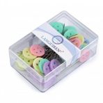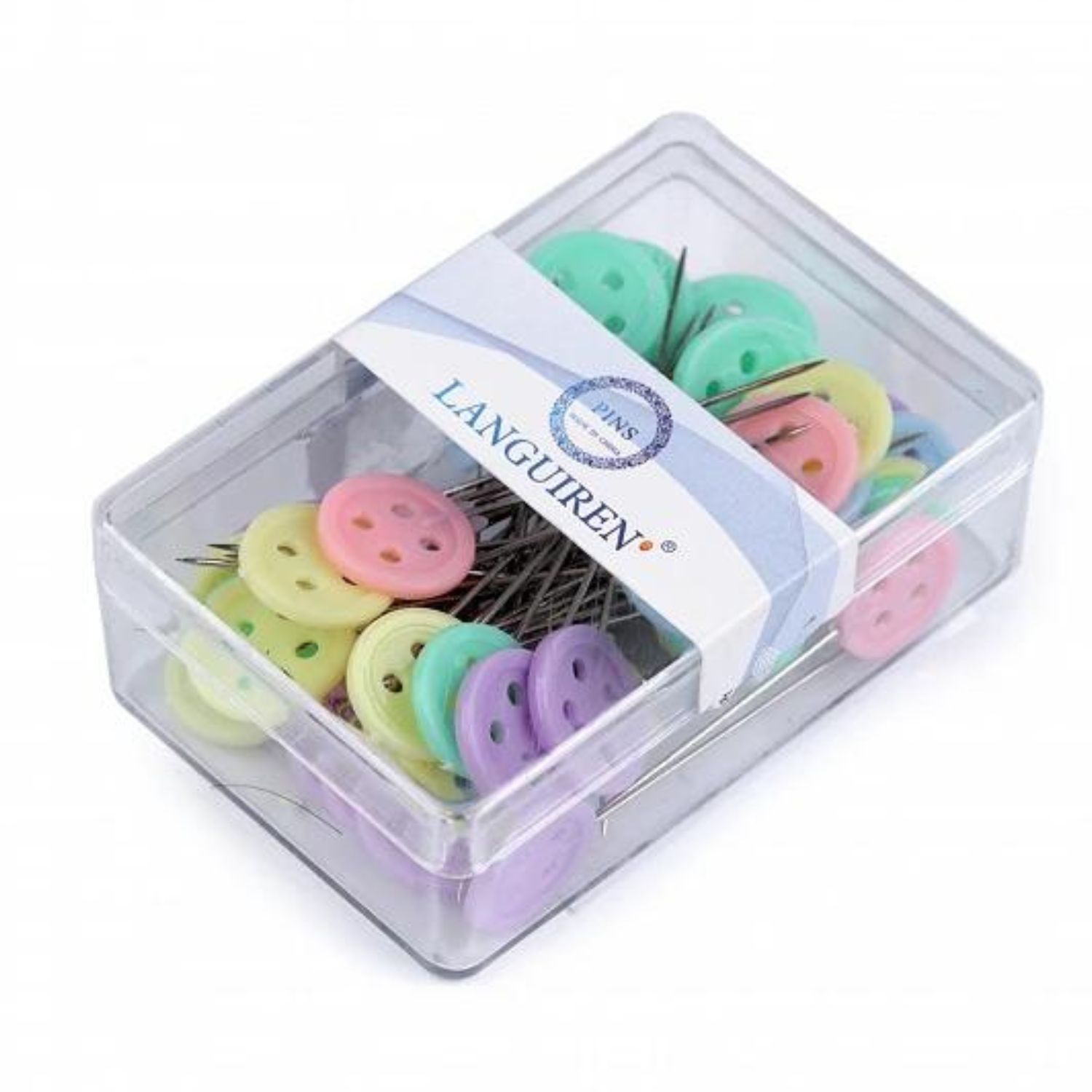 Zestaw szpilek do tkanin ze szklanym łebkiem w plastikowym pudełku o długości 34 mm. 80 szt. 12 g.